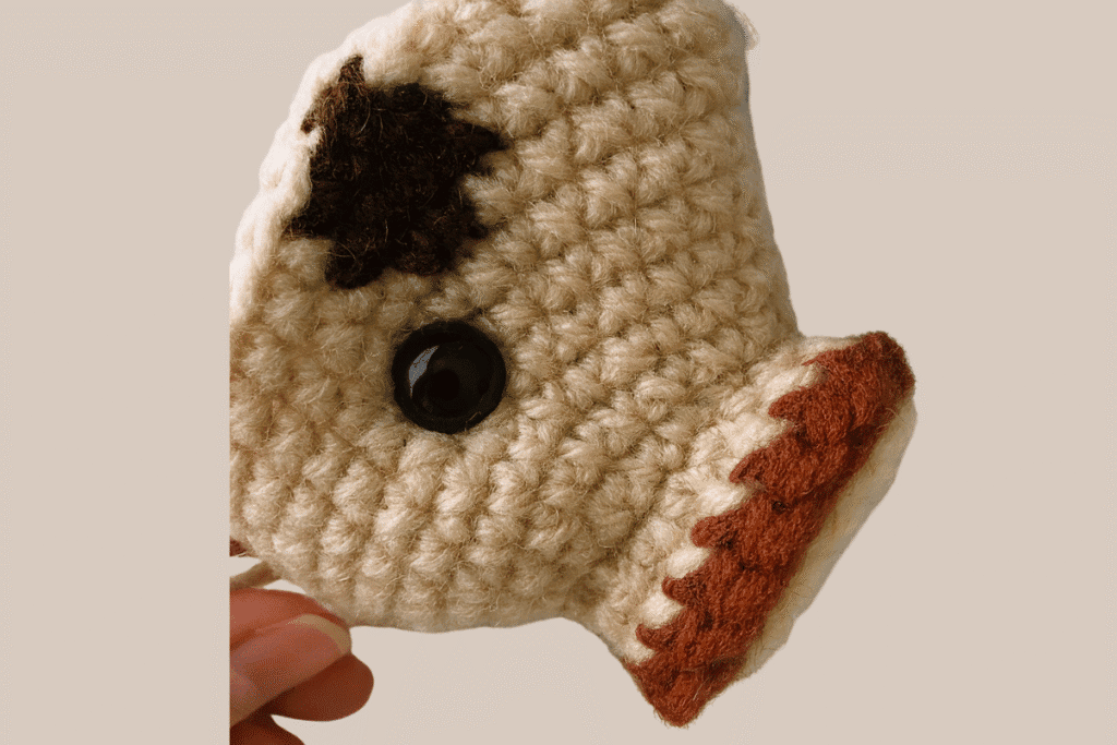 R9: Tie the two yarn ends securely and weave them in, or use your crochet hook to pull them to the back and tuck them inside the snout.